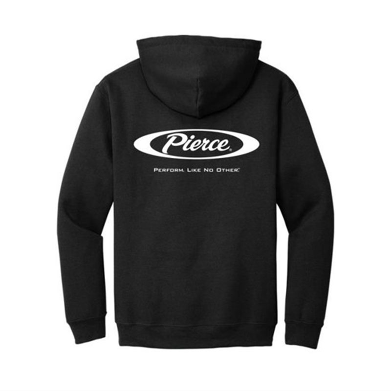 Black Hooded Sweatshirt with White GLICK/Pierce Maltese Cross logo on front left chest, White Pierce Logo on back.